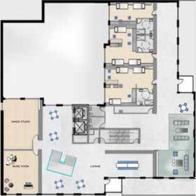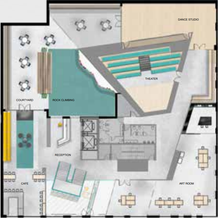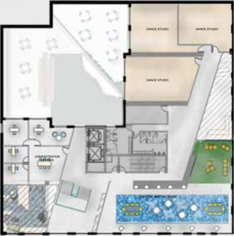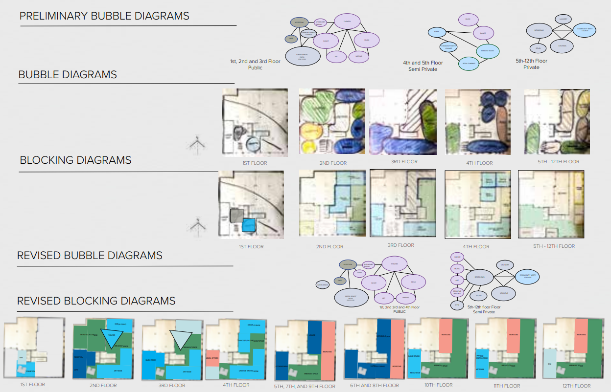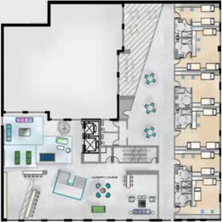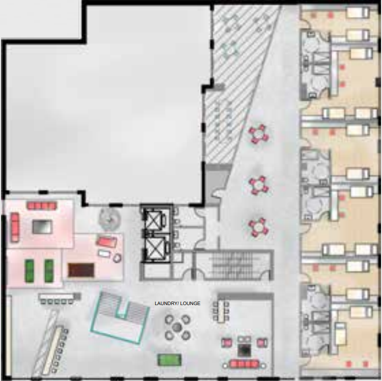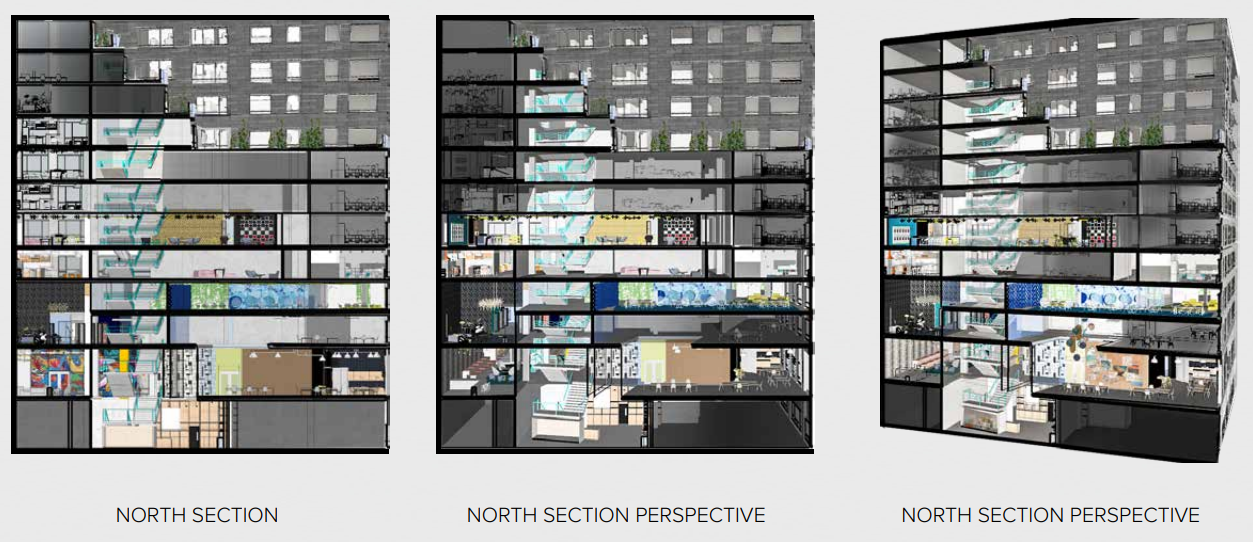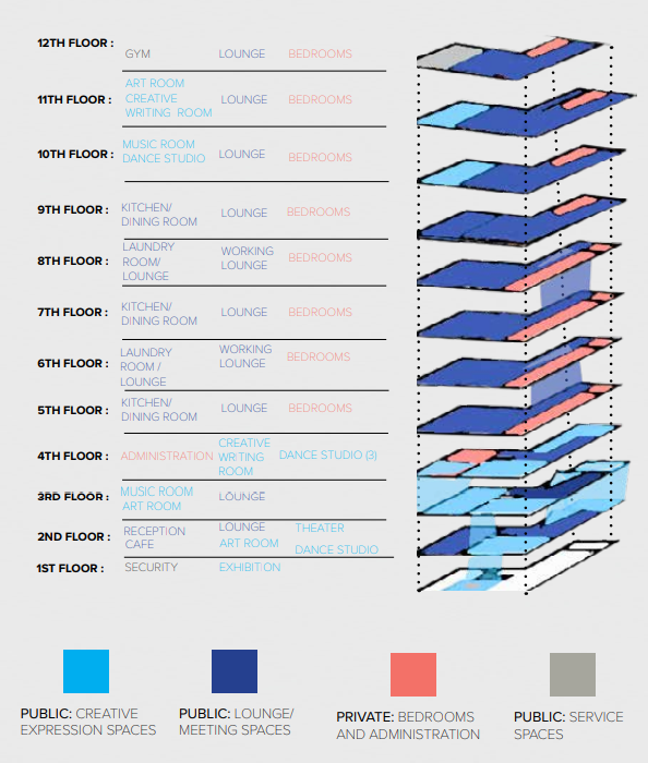 Surrounded by expression, creativity, determination, and support, students connect through vertical circulation, lighting, and transparency into other individuals’ creative mindsets. Strength is presented by contrasting materials and finishes that assist in developing a dynamic scheme. Vibrant colors and unique textures create a playful atmosphere and enhance the feeling of being immersed in energy, passion, and individuality upon entering Aila: Co-living Through Creative Expression
